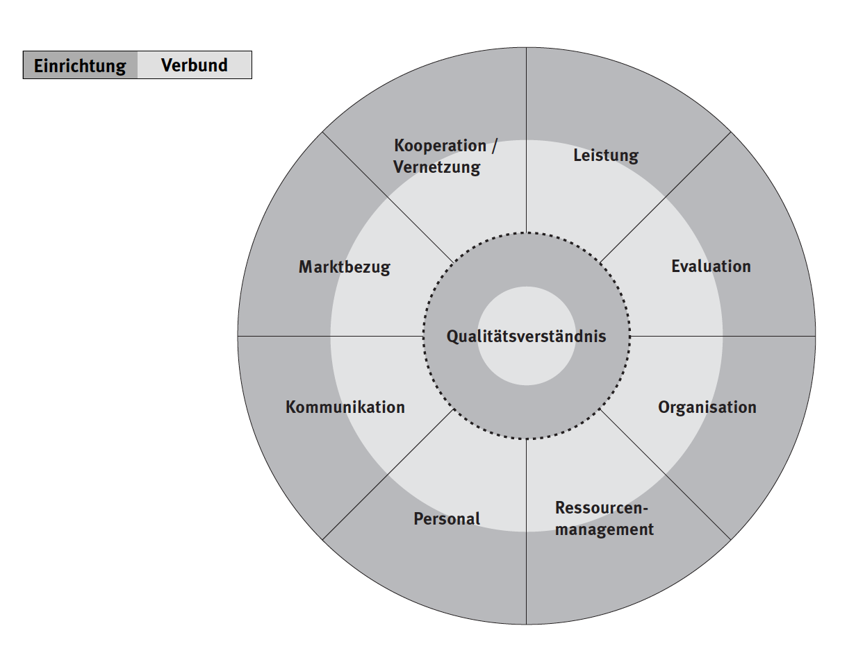 QVB ist ein dreistufiges Qualitätsmanagementmodell mit Anschlussfähigkeit an die DIN EN ISO 9001. In der Eingangsstufe QVB Stufe A werden Grundlagen für einen niederschwelligen Einstieg in das Qualitätsmanagement gelegt. Im Fokus steht die Formulierung eines passgenauen Qualitätsverständnisses sowie die Erfassung und Stukturierung der Organisation über acht Gestaltungsbereiche (siehe nebenstehende Grafik).